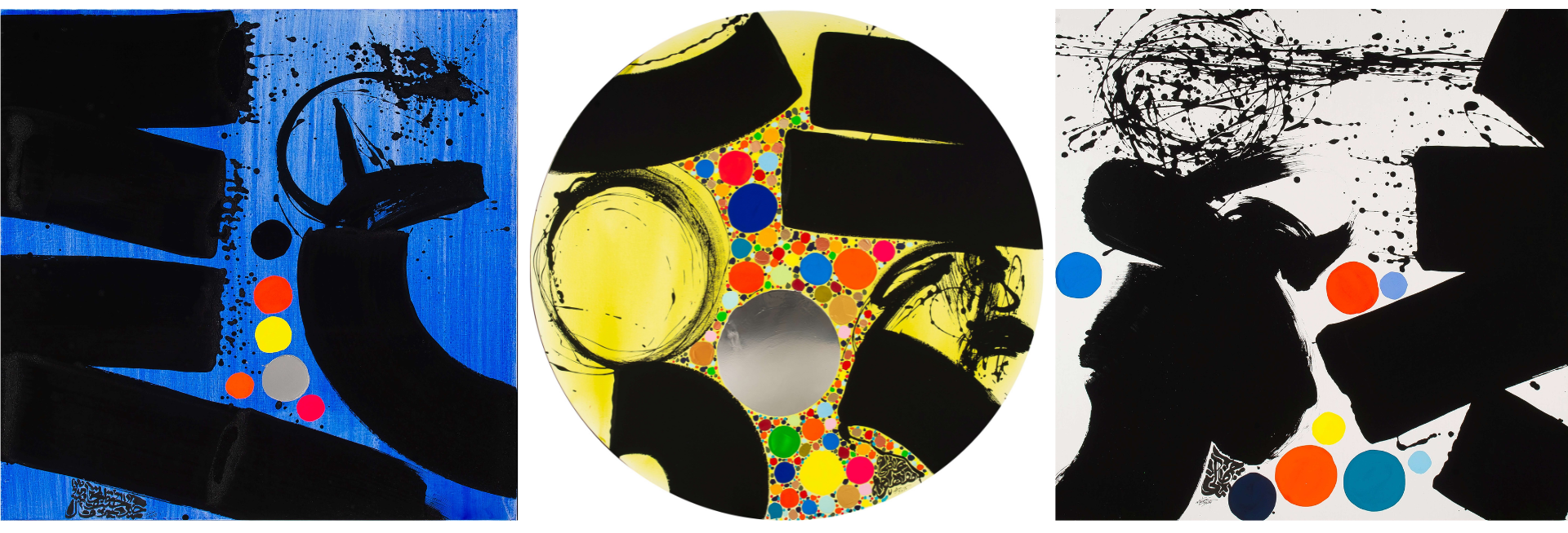 La calligraphie, surtout lorsqu’elle prend la dimension de vastes toiles est un langage du corps, une danse, une lutte effrénée avec la matière et avec soi-même : chaque toile, chaque encre est le fruit d’un moment, une photographie d’un temps T et si celle-ci est cadrée, ma pratique se fonde avant tout sur l’improvisation. Mais sous cette vision très actuelle de l’artiste que je revendique, demeure le socle indispensable, la base de tout, à savoir la calligraphie arabe traditionnelle au calame de roseau et à l’encre noire « smak » sur le papier blanc.